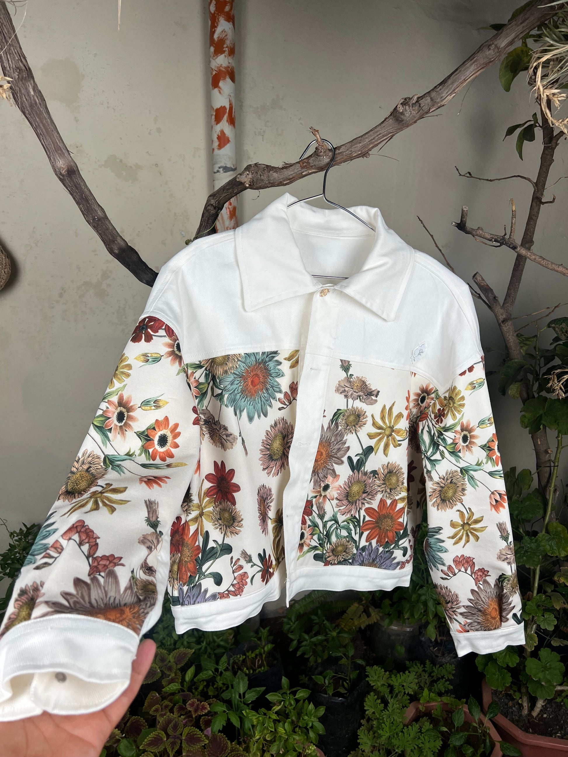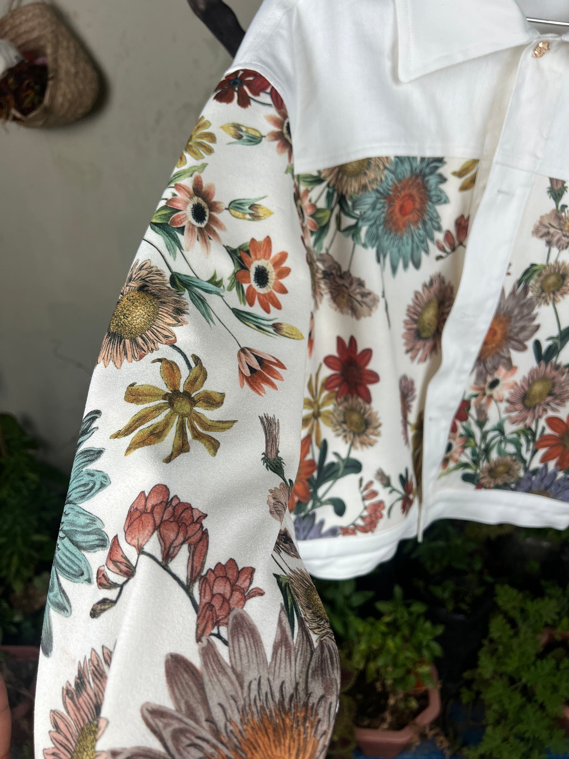 Ogni giacca è realizzata a mano in Marocco, combinando denim resistente con tessuto 100% cotone stampato con fiori vivaci. Il contrasto tra il bianco puro e i motivi floreali colorati la rende un capo elegante ma audace, pensato per chi desidera indossare l'arte nella vita di tutti i giorni.